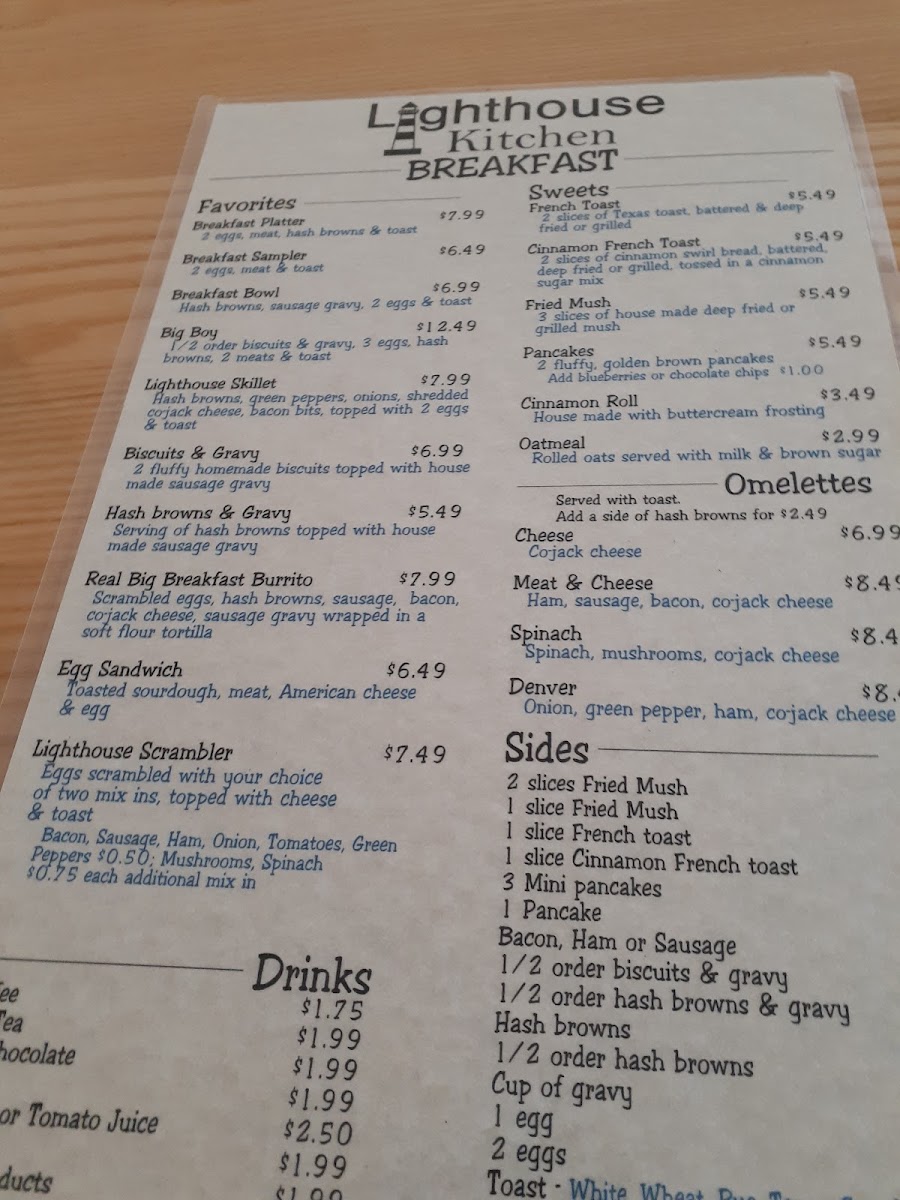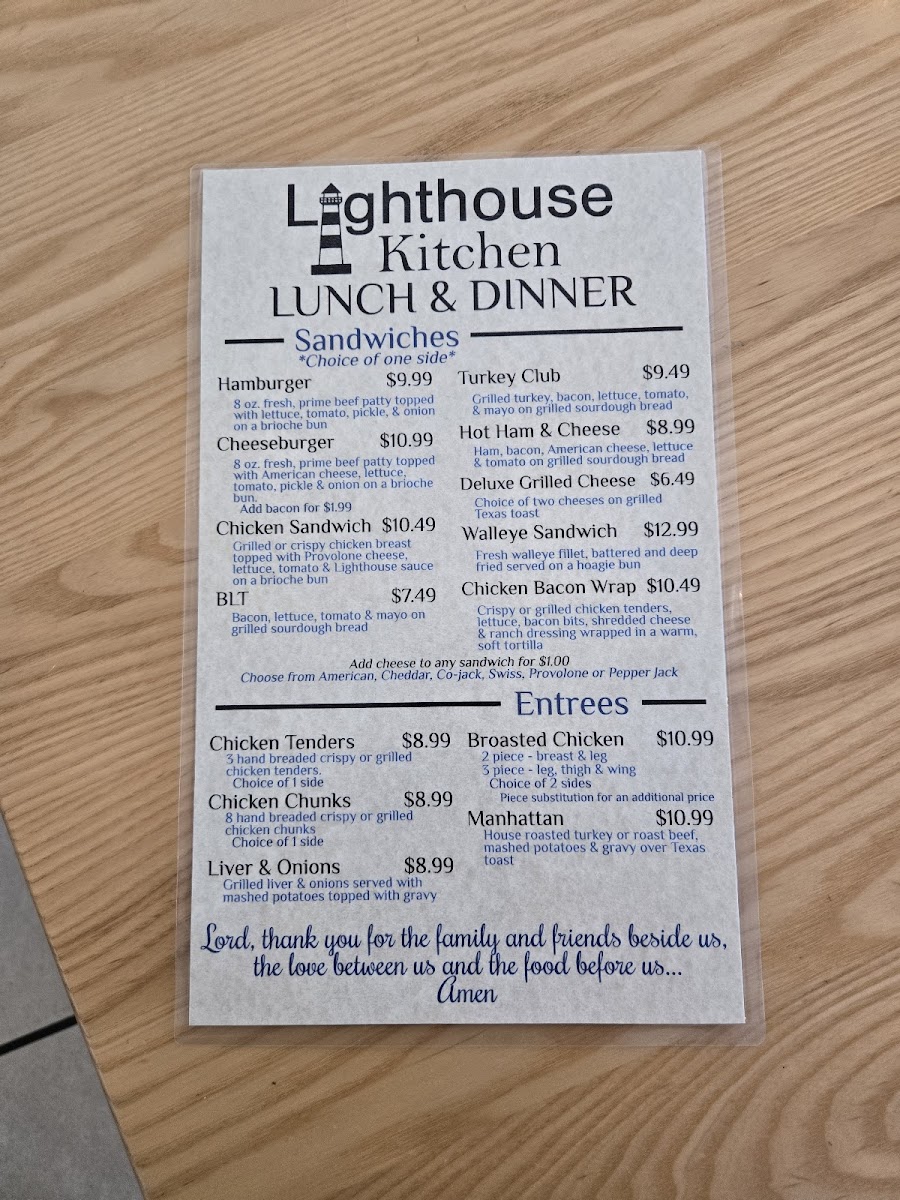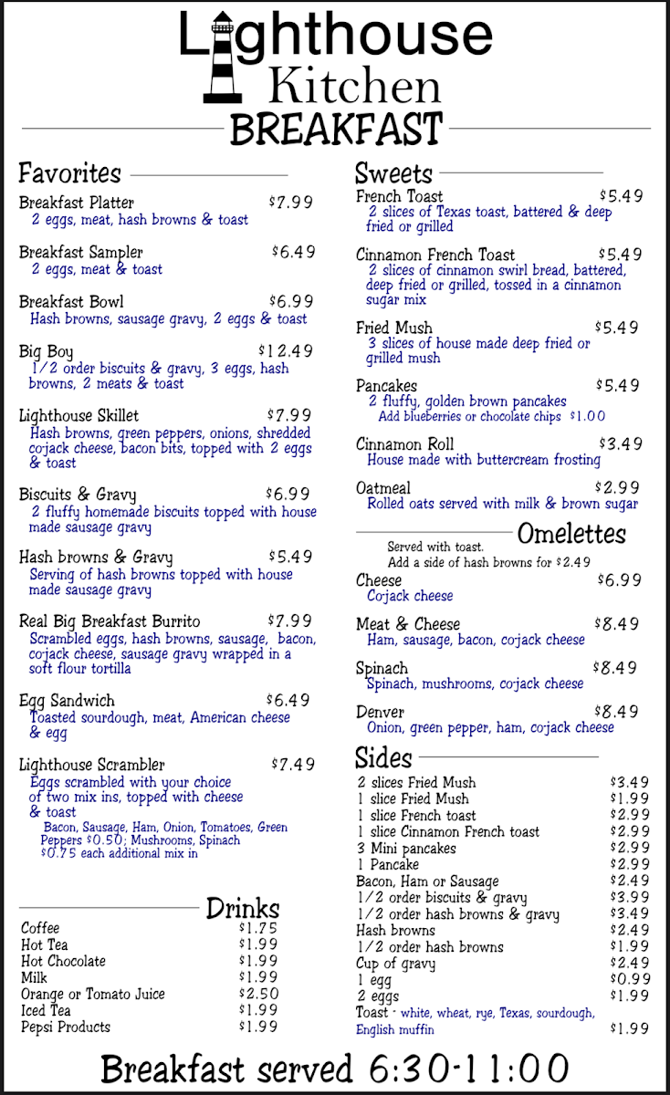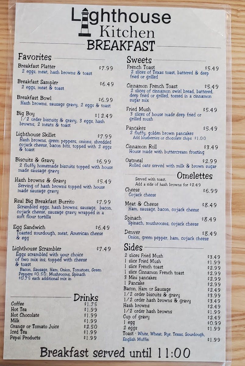Lighthouse Kitchen offers a delightful and well-rounded menu perfect for any time of day. Starting with breakfast, their Biscuits and Gravy provide a hearty and comforting choice to kickstart the morning. Moving into lunchtime, guests can enjoy a daily special with the Soup of the Day, which offers a warm, fresh option to satisfy your midday cravings. For dessert, Lighthouse Kitchen doesn’t disappoint with their ever-changing Cheesecake of the Week, adding a sweet touch to the meal. To wash it all down, the restaurant serves refreshing Pepsi products, ensuring a cold and fizzy complement to your meal. Whether you're stopping by for breakfast, lunch, or just a treat, the menu at Lighthouse Kitchen provides simple yet delicious options that are sure to please any palate.