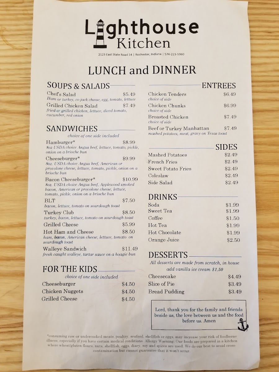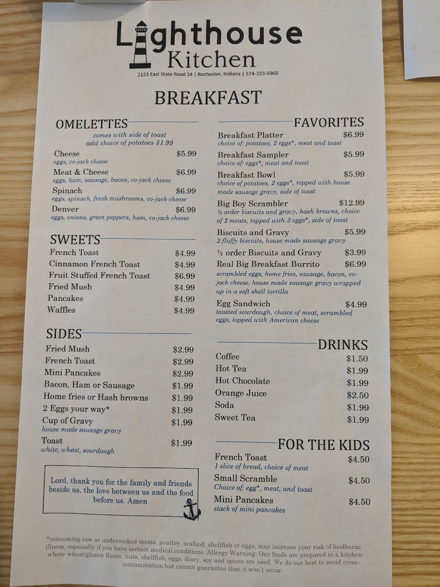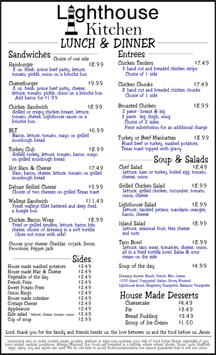 Lighthouse Kitchen offers a delightful and well-rounded menu perfect for any time of day. Starting with breakfast, their Biscuits and Gravy provide a hearty and comforting choice to kickstart the morning. Moving into lunchtime, guests can enjoy a daily special with the Soup of the Day, which offers a warm, fresh option to satisfy your midday cravings. For dessert, Lighthouse Kitchen doesn’t disappoint with their ever-changing Cheesecake of the Week, adding a sweet touch to the meal. To wash it all down, the restaurant serves refreshing Pepsi products, ensuring a cold and fizzy complement to your meal. Whether you're stopping by for breakfast, lunch, or just a treat, the menu at Lighthouse Kitchen provides simple yet delicious options that are sure to please any palate.